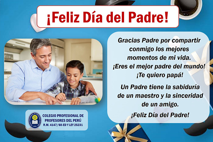 El Día del Padre se celebra en el Perú el tercer domingo del mes de junio. Los peruanos rendimos homenaje al Padre que cumple una función importante en la vida familiar, que es cuidar, proteger y orientar a la familia con dedicación y cariño. El Padre responsable cumple con la educación, salud, y bienestar de los hijos. En muchos hogares peruanos, este día se convierte en una ocasión especial para mostrar agradecimiento por el amor y el esfuerzo realizado por los padres.